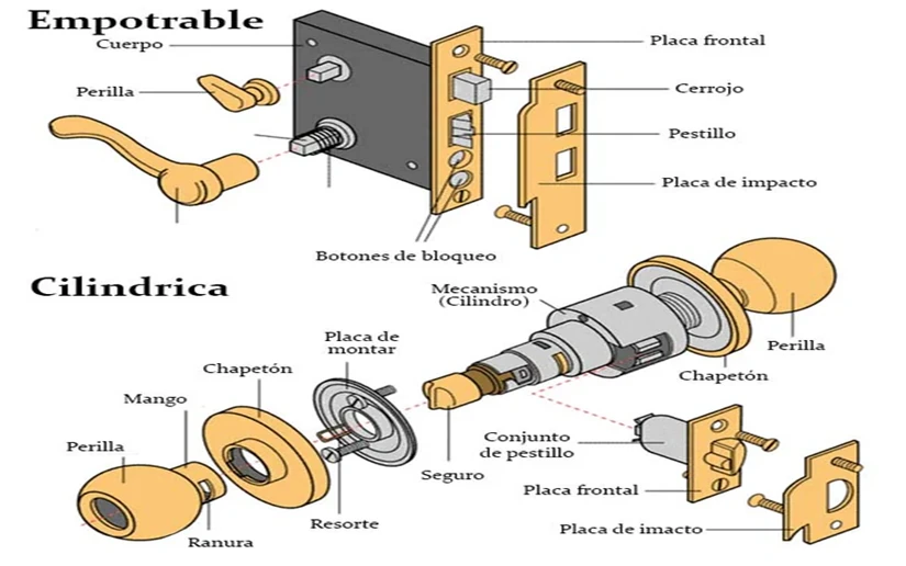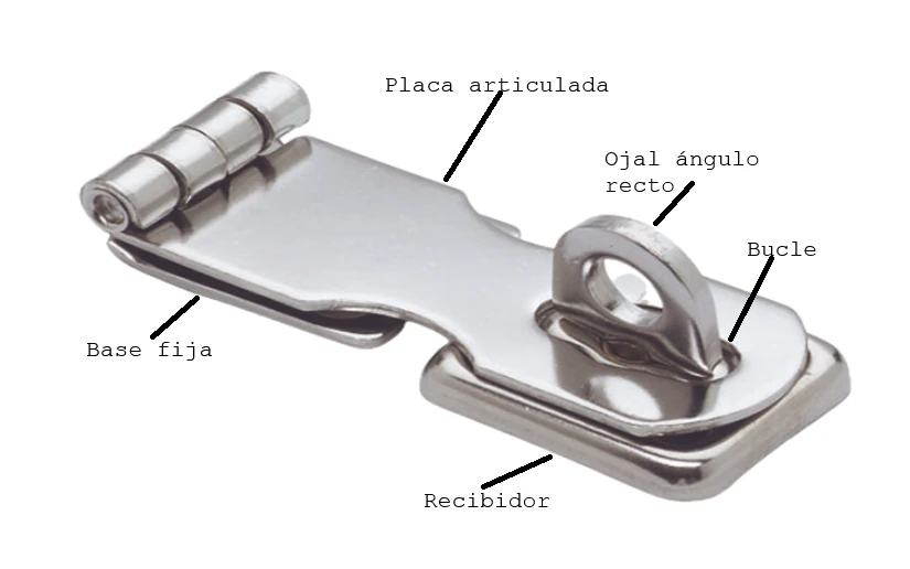 El Picaporte es un mecanismo que permite abrir y cerrar la puerta. Esta compuesto de una base, el resbalón y recibidor, tanto la base como el recibidor tienen un ojal de angulo recto para asegurar el candado.